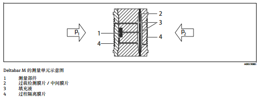 E+H電子差壓變送器PMD系列測量原理:在壓力 p1和p2作用下兩側的金屬過程隔離膜片 (4) 發生形變。填充液 (3) 將壓力傳輸至電阻橋路上 ( 半導體技術 )。測量與差壓相關的橋路輸出電壓變化量,并進行后續處理。