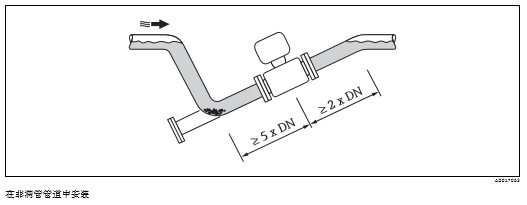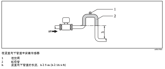 測量管中發生氣泡積聚現象時,會增大測量誤差。因此,請避免在管道中的下列位置上安裝: • 管道的高點 • 直接安裝在向下排空管道的上方 在豎直向下管道中安裝 在豎直向下管道(h ³ 5 m (16.4 ft))中安裝時,需要在傳感器下游處安裝虹吸管或泄放閥,避免抽壓 時損壞測量管內襯。此外,還可以防止液體短暫停滯在測量管中,產生氣障。