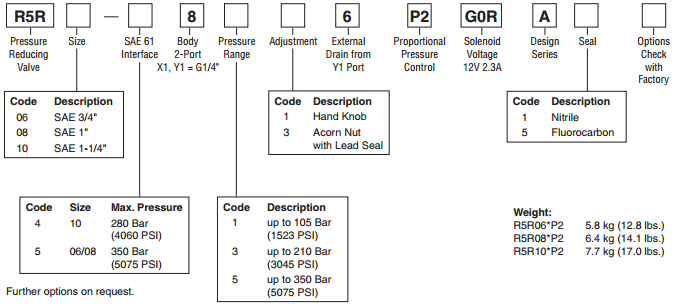 比例減壓閥R5R*P2都是基于機械調整序列R,機械先導閥和主級之間的附加比例單元允許連續壓力調節。最佳性能可與數字放大器模塊PCD00A-400來實現。該比例閥具有按比例電磁鐵連續調整的功能,可隨著機械的最大壓力調整,2端口體與SAE61凸緣,3種尺寸(SAE¾“,1”,11/4“),3級壓力。