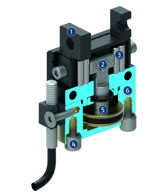 SCHUNK MPG 16產品結構圖如下,活塞通過壓縮空氣上下移動。 側面鉤在活塞桿引導件的上端,在兩個基座爪的角槽中,從而將該運動轉變成基指的同步打開或關閉。