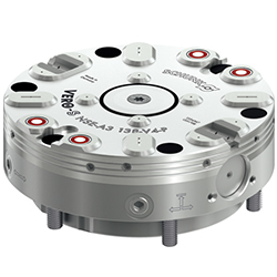 內部裝配的彈簧組提供模塊的夾持力。軸向活塞和專利驅動機構將彈簧力轉化為夾持銷上的最大下拉力。夾持是由兩個夾持滑塊實現(xiàn),自動鎖定。此外,集成的增壓功能會增大下拉力。模塊可使用 6 bar系統(tǒng)壓力打開。